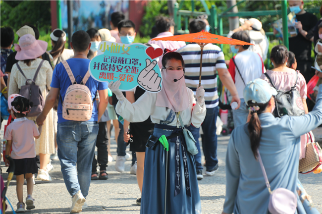 趣味防疫#戴1米官帽提醒游客保持距離#