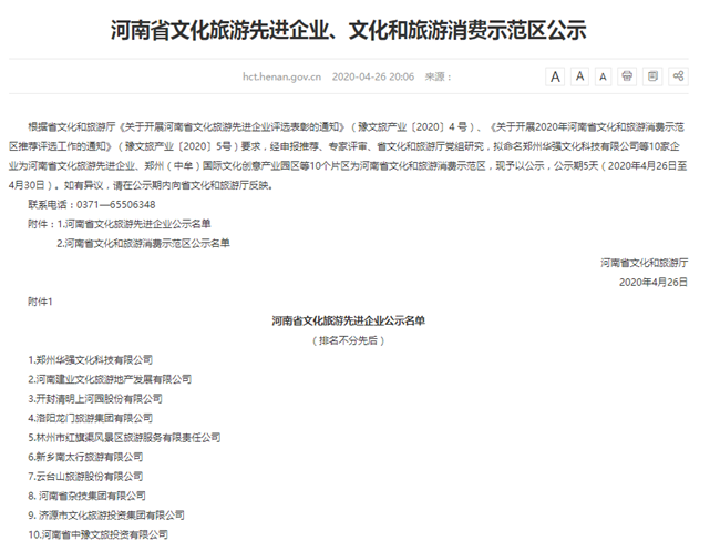 河南省文化和旅游廳的公布的河南省文化旅游先進(jìn)企業(yè)名單中,