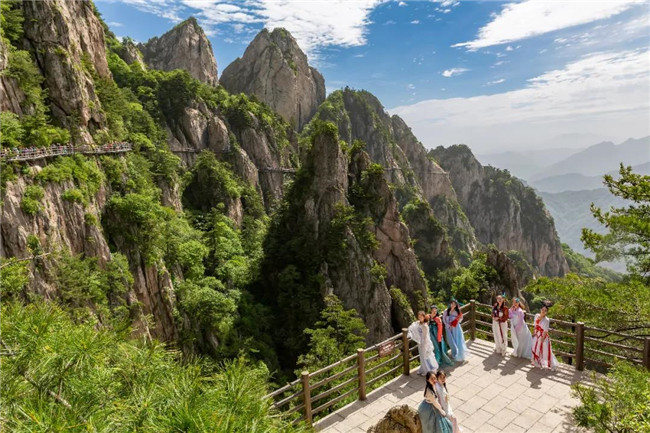 在中天門,高山花海節(jié)正在火熱進行中,這里就像是一個花的海洋。在峰林索道入口處,有一段紫藤花打造的“紫云漫”長廊,一眼看去,有點被驚艷到?在這里,約上喜歡的人,和TA漫步在紫藤花下,吹著微風(fēng),想想都浪漫極了,這里作為老君山最上鏡的地方之一,千萬別忘了與這紫色的浪漫一起留下你最美的身影。