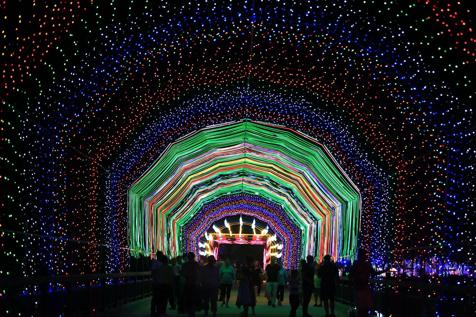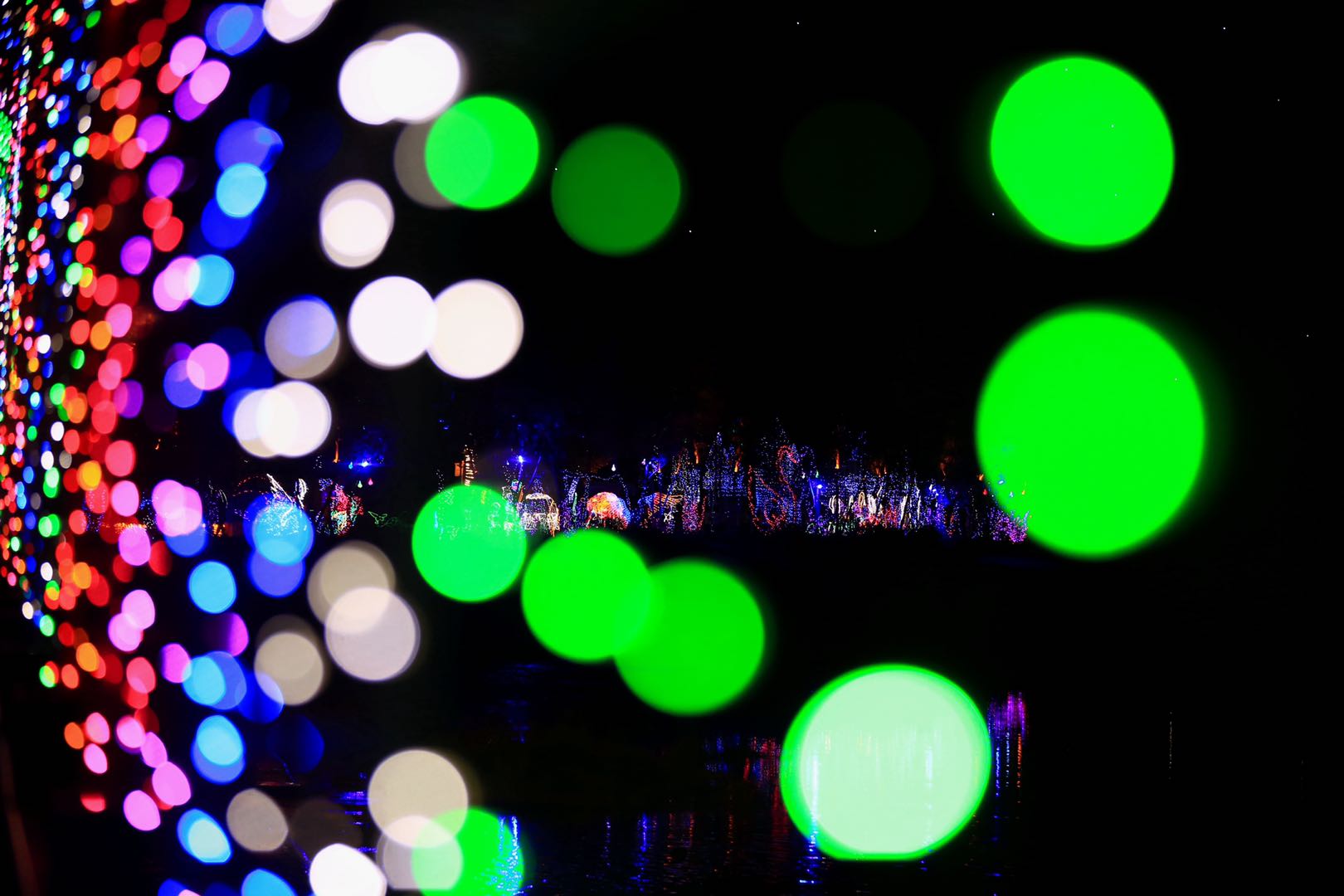 篝火晚會臨近尾聲時,山水燈光秀揭開序章。幾百組燈光組成的色彩繽紛的光影世界,與水中的倒影融合為一體。最新的視覺科技,5D激光秀將變幻莫測的動物世界投射在山體之上,令游客紛紛驚嘆,流連忘返。