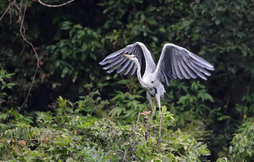 這群精靈就在這寧?kù)o而富饒的兩岸樹上筑巢、求偶,繁衍生息,這美麗的千島湖畔成為這群蒼鷺的天堂。我去這里觀鳥已不下十次,有個(gè)暑假還帶上孩子下湖觀鳥,給他講解鳥類知識(shí),怎么懂鳥愛鳥護(hù)鳥。原先,下湖后一般2分鐘不到就能看到庫(kù)灣兩岸樹枝上停著數(shù)不清的蒼鷺,可那天奇怪了,一只看不到。我們就在湖上轉(zhuǎn),10分鐘、20分鐘過(guò)去還是看不到一只鳥,小船就在湖面上開著,眼看著馬上到大壩,老方說(shuō)去左邊灣里看看,看樣子今天的觀鳥變尋鳥了。哈哈,沒有沒有,回吧。也就那么一瞬間,我一回頭,看到大壩后面的小山頭一群鳥兒驚向天空,我大喊:老方掉頭掉頭去大壩。原來(lái)那天湖面上風(fēng)特別大,蒼鷺都集中在一個(gè)有陽(yáng)光又避風(fēng)的山岙里。接下來(lái)就是相機(jī)舉得手臂發(fā)酸,快門按得手指發(fā)軟。好照片不多,但很快樂開心。