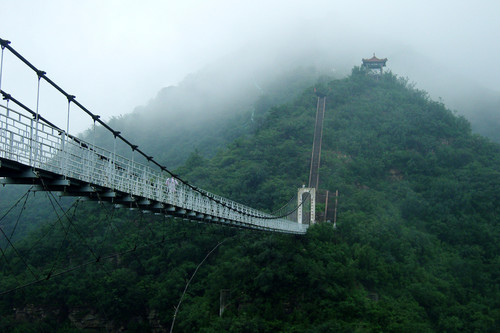 絡(luò)絲潭景點(diǎn)位于濁漳河天橋斷處,這里有獨(dú)特的峽谷風(fēng)光,更有神奇的美麗傳說(shuō)。漳河水從峽谷斷崖上飛瀉成瀑,如白馬玉龍,咆哮翻卷,墜入水深百米的絡(luò)絲潭中。夏季多雨時(shí)節(jié),河水暴漲,跌落峽谷,生若雷鳴,其勢(shì)狀若壺口瀑布,蔚為壯觀(guān)。峽谷之上架一索橋,連通冀豫兩省,名曰天橋。人行橋上,宛如九霄步云。側(cè)觀(guān)飛流狂濤,俯瞰深澗幽潭,彩虹飛掛,情趣無(wú)限。峽谷南側(cè),激流掏出天然石洞,深達(dá)百米,鬼斧神工,沿螺旋梯拾階而下,可直達(dá)神龜洞。